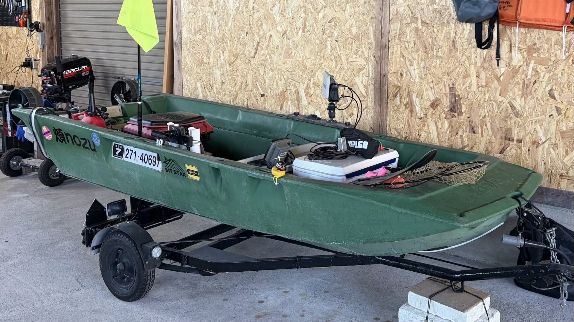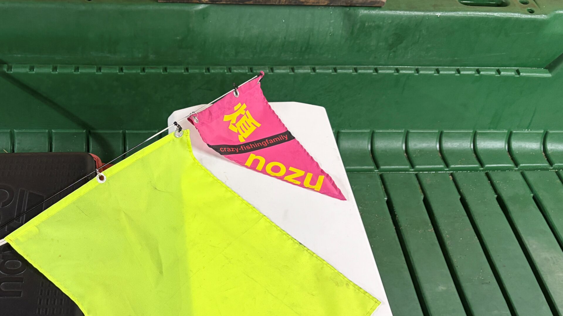 旗の部分はAmazonの市販品です。旗の色は絶対に「赤」か「蛍光イエロー」がオススメ。 赤はどんな時でも程よく目立ちます。黄色は夕暮れ時などは少し景色と同化しやすいですが、それでもよく見えます。逆に、僕のボートのような緑色は、海の上ではホントに目立ちません!(笑)