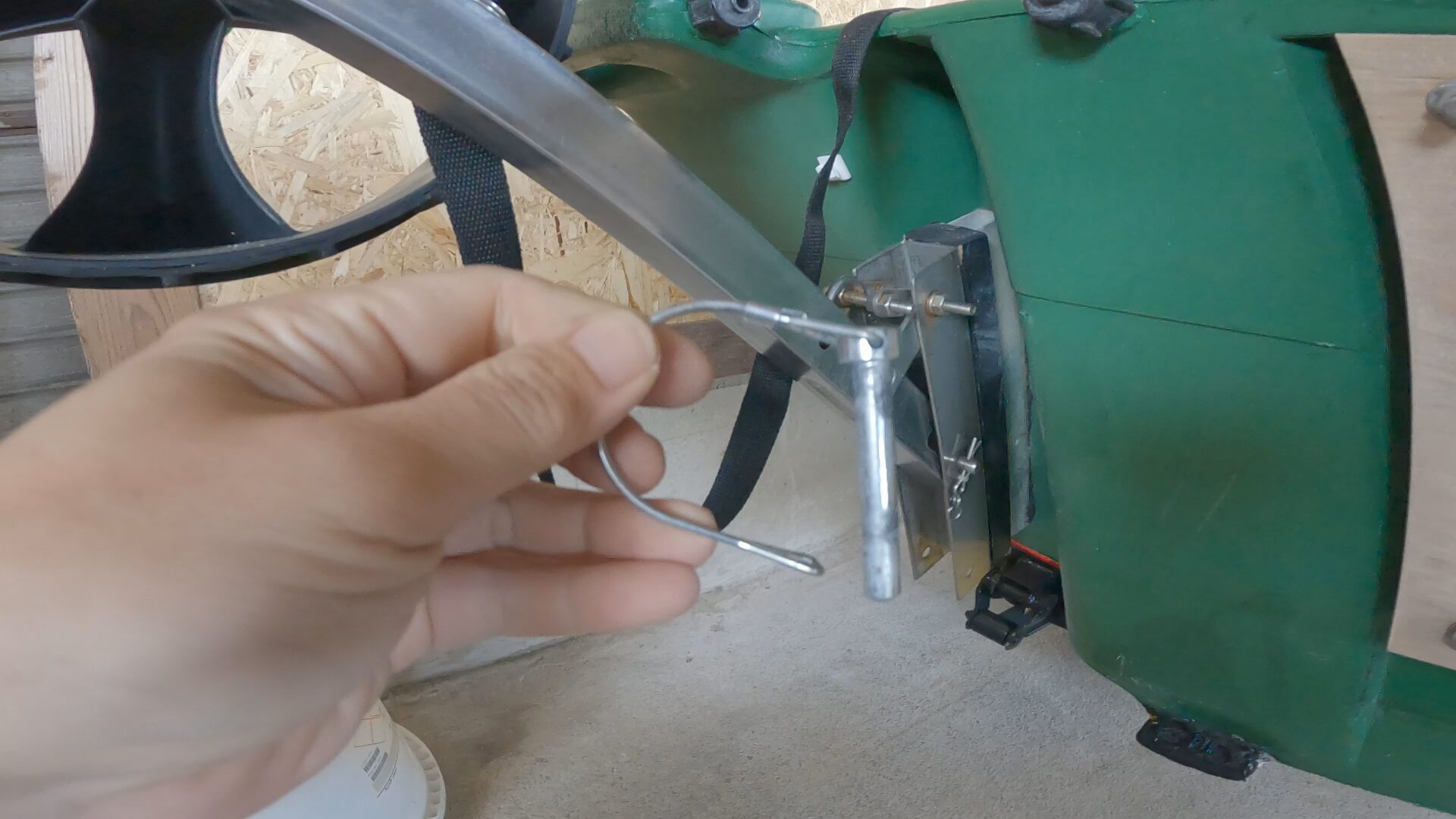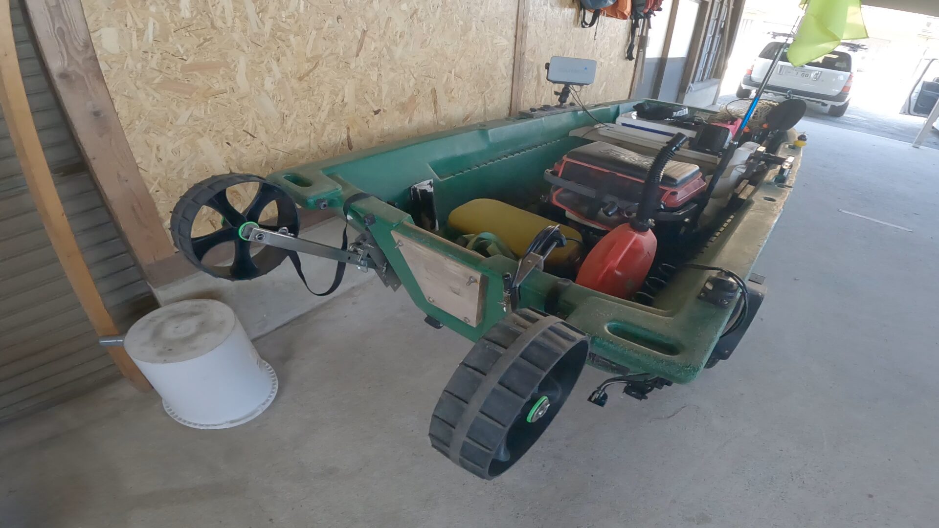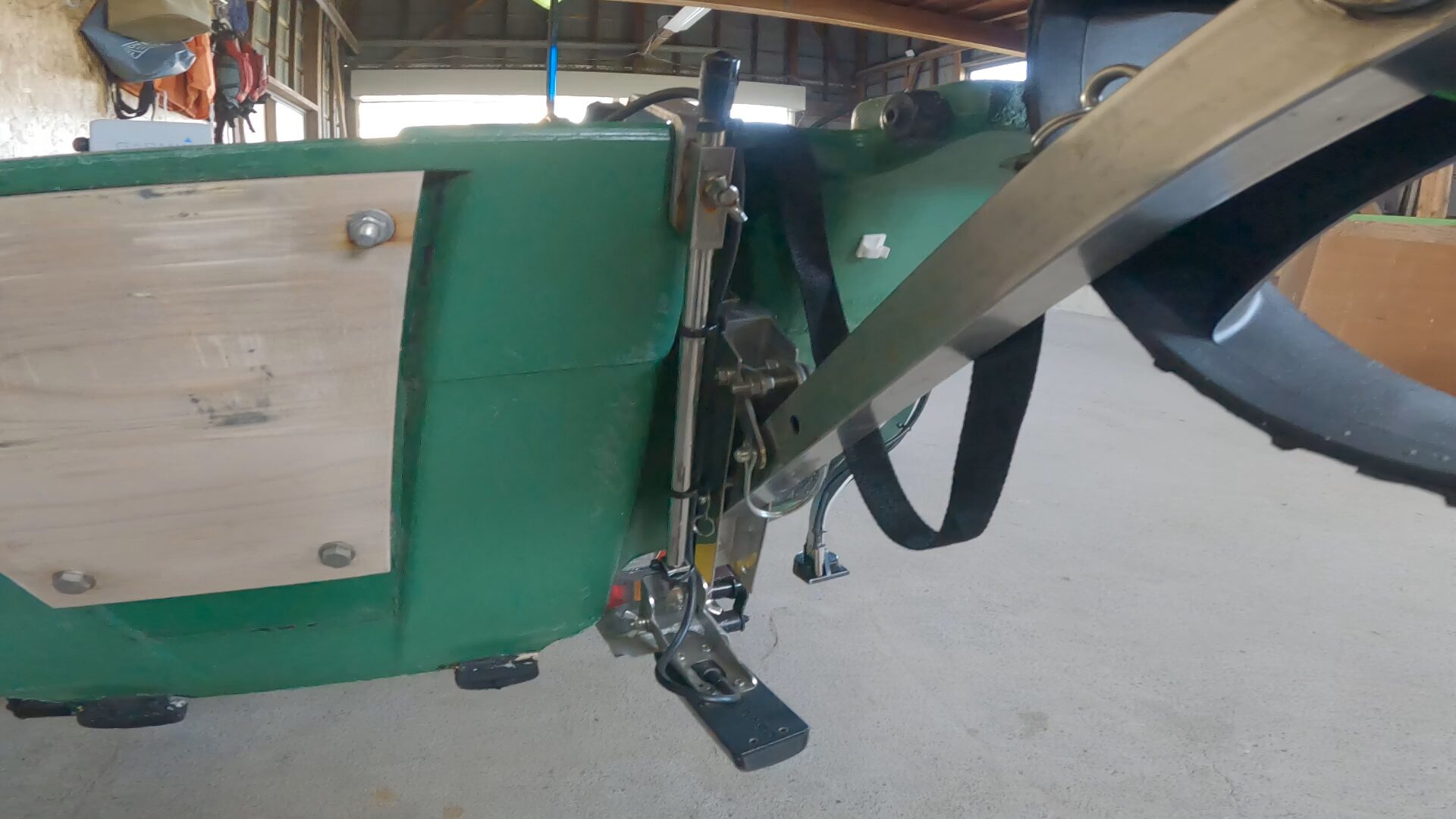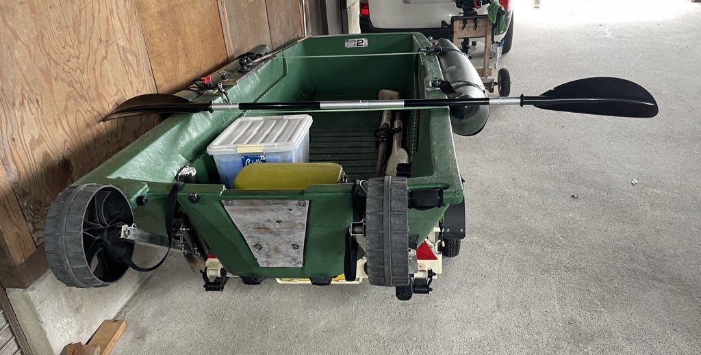リトルボートさんのGEB-30用ドーリーを使っているのですが、砂浜でも引っ張りやすいようにタイヤを変更し外径を大きくしました。その結果、純正の跳ね上げ機能が使えなくなってしまいました。