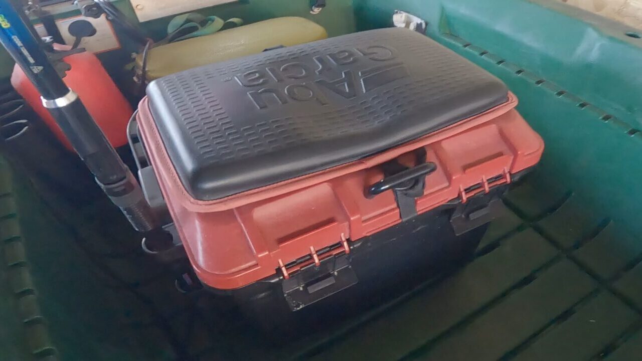 椅子としても使っているタックルボックスは、定番のドカット4700。上に現在は販売終了のABUのクッションを敷いています。