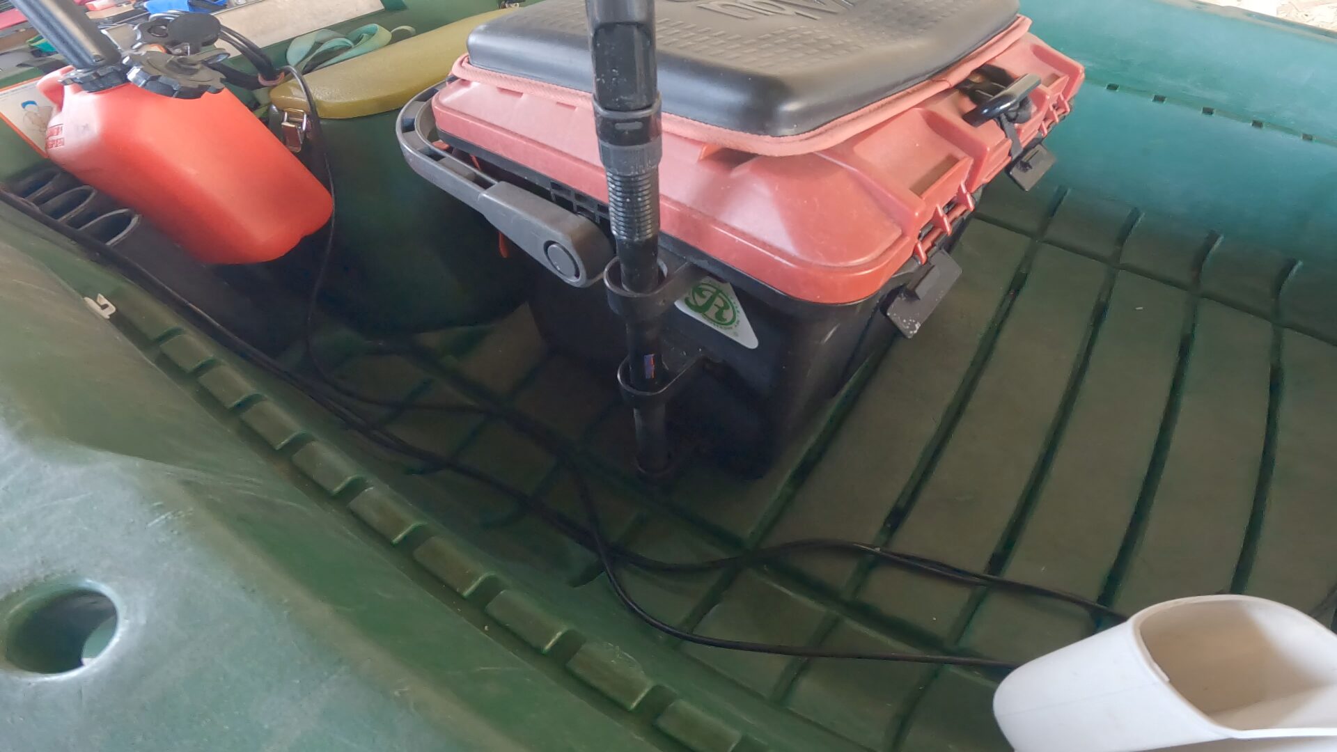海上で他の船に自分の存在を知らせる認証旗は、500円で買った3mの投げ竿をポール代わりにしています。椅子兼タックルボックスのドカット4700にイレクターのジョイントを取り付け、ポール立てとして使っています。ちょうど背中の辺りにポールがくるようにしているのでキャスト時にも邪魔になりません。