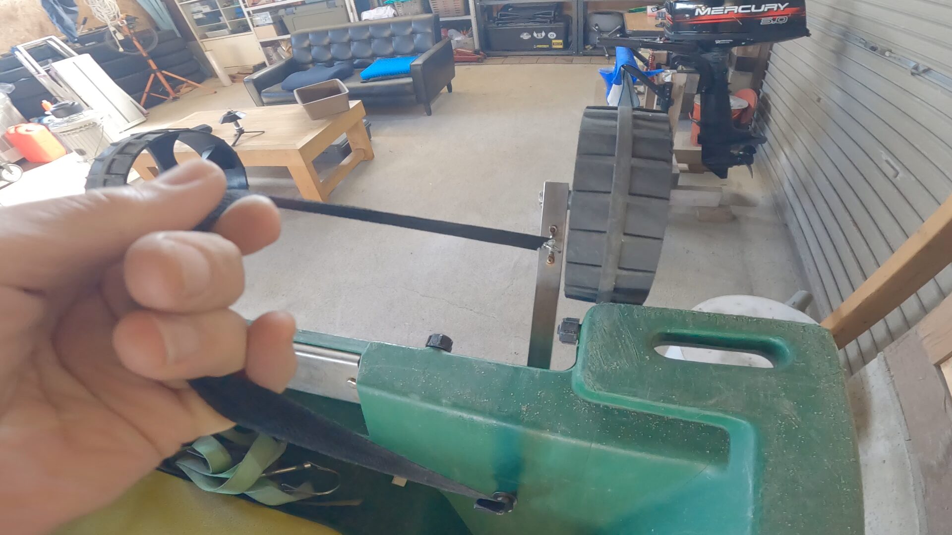 このタイヤは水に浮かないため、沖に出るとドーリーが自重で下がります。バンドを引っ張るだけで、手を濡らさずに跳ね上げることができるようにしています。