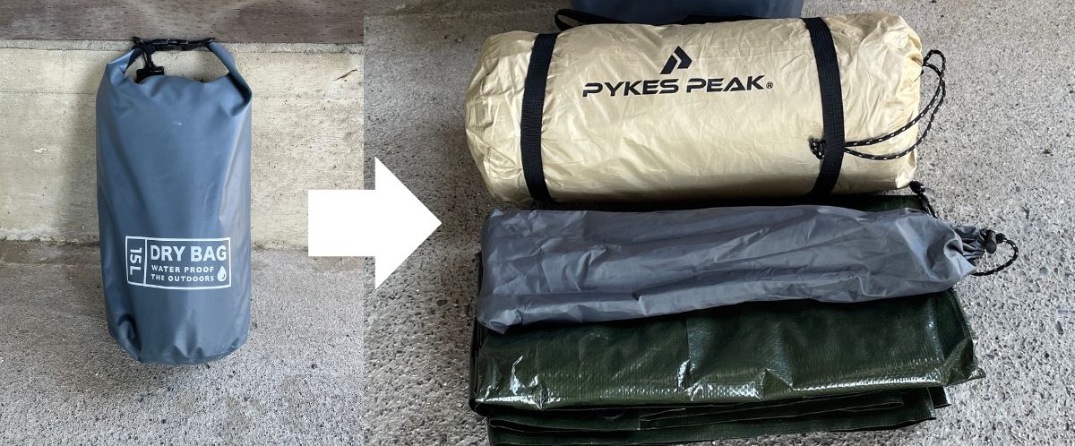 ダイソーの15L防水バッグにはソロ用テントとグランドシートを入れています。ギリギリは入ります。