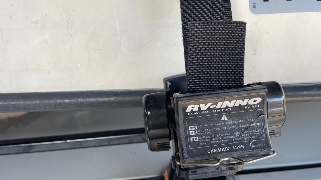 ベルトでしっかり固定します。左右にズレないかも確認しましょう!ほかにもボートローラーの固定ボルトやキャリアの固定ボルトなどのキャリアの各部品に緩みがないかも確認しましょう!!