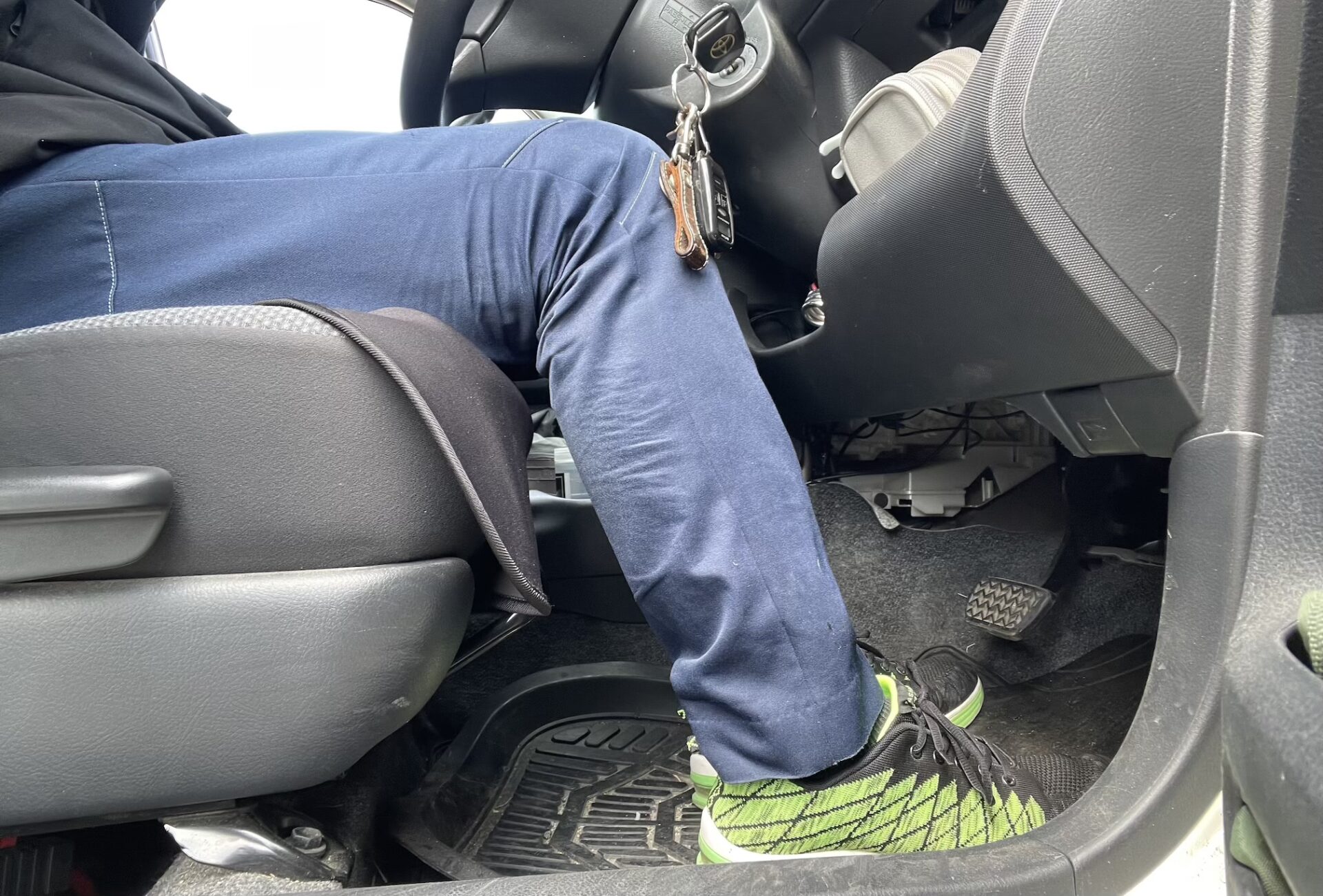 36判を積むためには、運転席と助手席をかなり前までスライドさせる必要があります。上の写真のような状態ですね。 正直に言うと、運転姿勢はかなり窮屈です…!